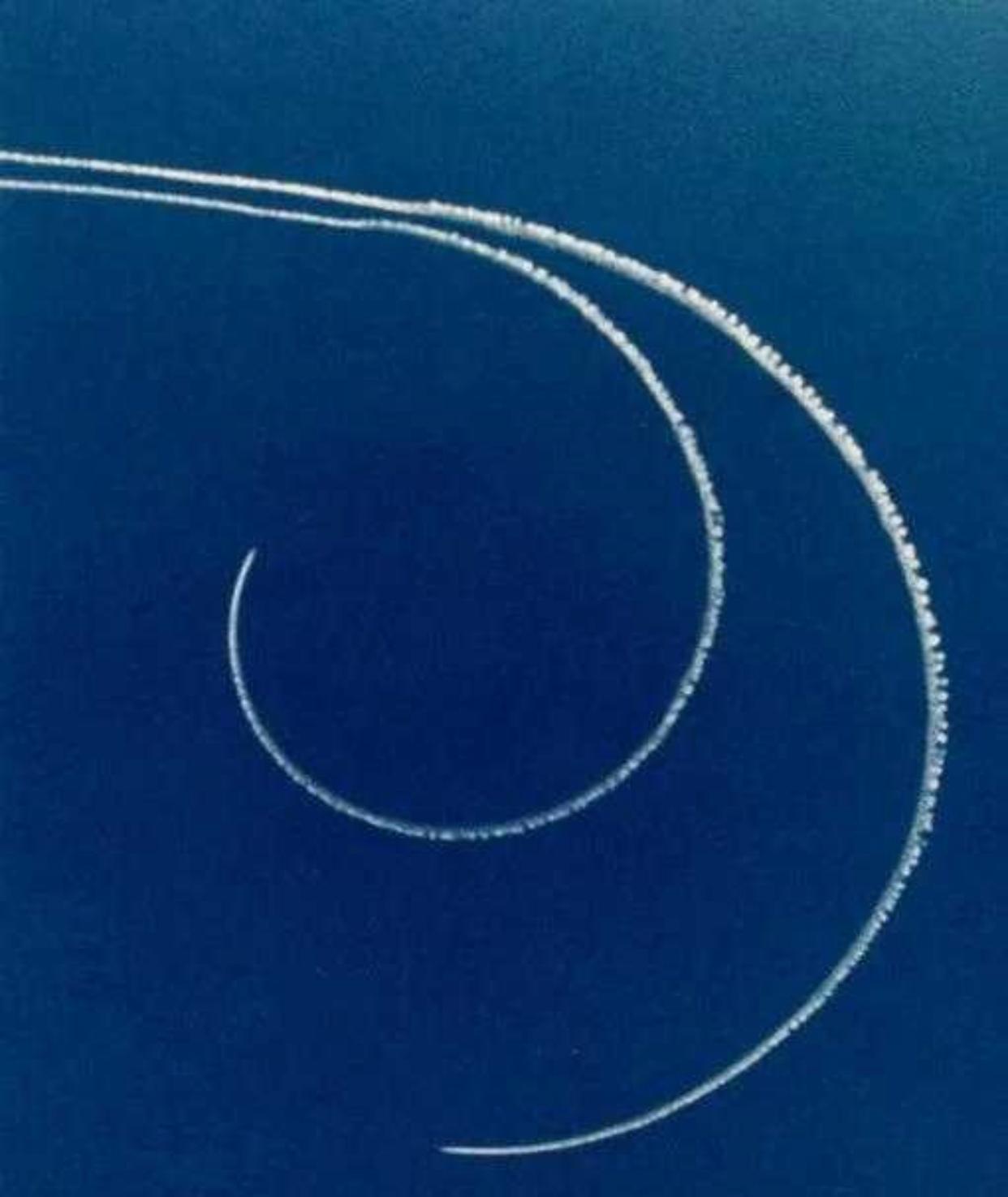 就以下图举例。下图中是两架战斗机的转弯半径尾迹,里面那个圈是三代机F-16A型战机的尾迹,外面那个圈是二代机F-4战机的尾迹。
